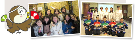 向中国的同学介绍宫城的传统艺能“麻雀舞”,通过一起舞蹈,学习彼此尊重、相互理解,加深友谊。