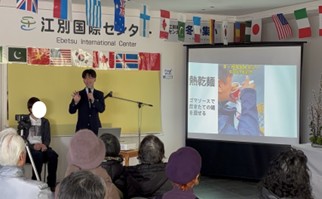 江別市の方々に向けて、私の故郷・武漢を紹介しました。プレゼンでは有名な黄鶴楼や武漢大学、朝食の定番・熱乾麺を紹介し、武漢の人々が自転車に乗りながら熱乾麺を食べる様子の動画もお見せしました。