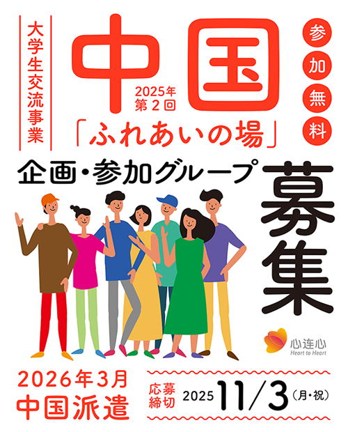 「大学生交流事業」は、日本の大学等に在籍する大学生等と、中国「ふれあいの場」との日中文化交流事業です。