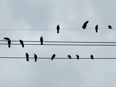 ※日本ではカラスは不吉の象徴であるとともに、知性的で時に愛嬌のある動物と捉えられています。この作品は後者のカラスイメージにぴったりで、ぱっとしない空の下で、自らを楽譜に見立てて遊んでいるカラスがうまく表現されていると思います。
