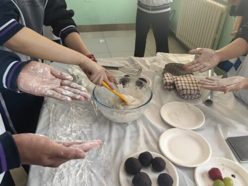 料理教室の準備が整うと、大福作り体験イベントが本格的に始まりました!学生たちはボランティアから教わった作り方のポイントを確認し、手を洗い、ボランティアのサポートのもと、制作体験を進めました。