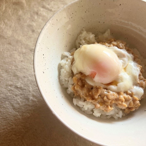 1枚目は、ご飯の上に納豆と温泉卵を乗せたもの