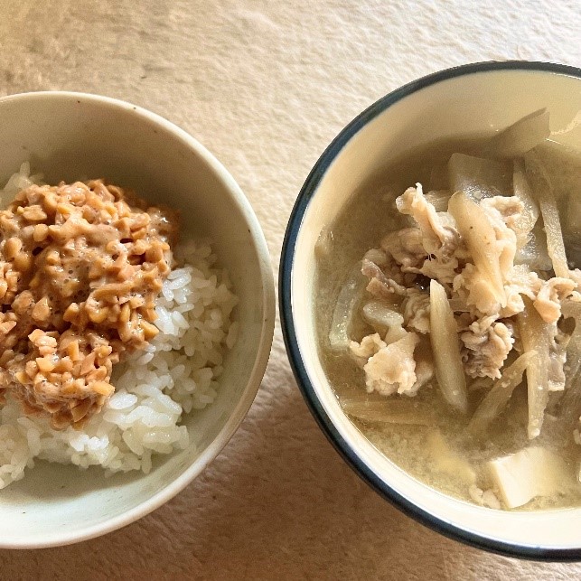 3枚目は、ご飯の上に納豆、豚汁