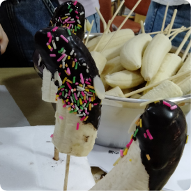 我们设立了巧克力香蕉和钓零食摊位,并在舞台上表演了日本北海道渔民劳动之歌《索兰节》和日本广播体操。在钓零食摊位上,我们汇集了日本各地的特色名点和经典零食,让大家接触到了日本广受欢迎的各类点心。巧克力香蕉深受来场者喜爱,供不应求,始终处于缺货状态。
