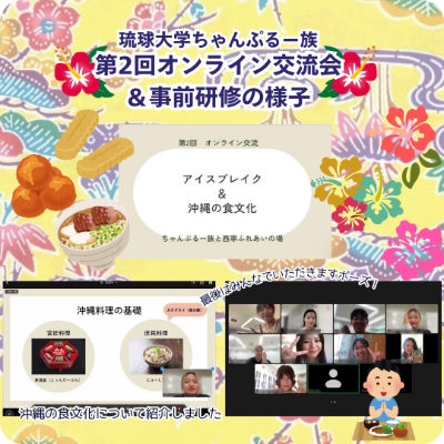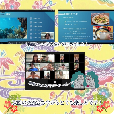 第一次活动通过暖场游戏与分组聊天室的小规模自我介绍,增进了与中国学生们的感情。同时也介绍了几项冲绳文化,并就彼此文化的共通点与差异点交换了意见。