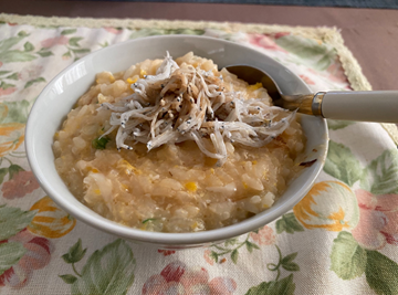 我每天都是跑完步再吃早餐。因为早上想吃有益于消化的食物,所以我一般都是喝粥,吃纳豆。今天是放了柳叶鱼的鸡蛋粥。有时为了节约时间也会吃香蕉和蛋白质(笑)。