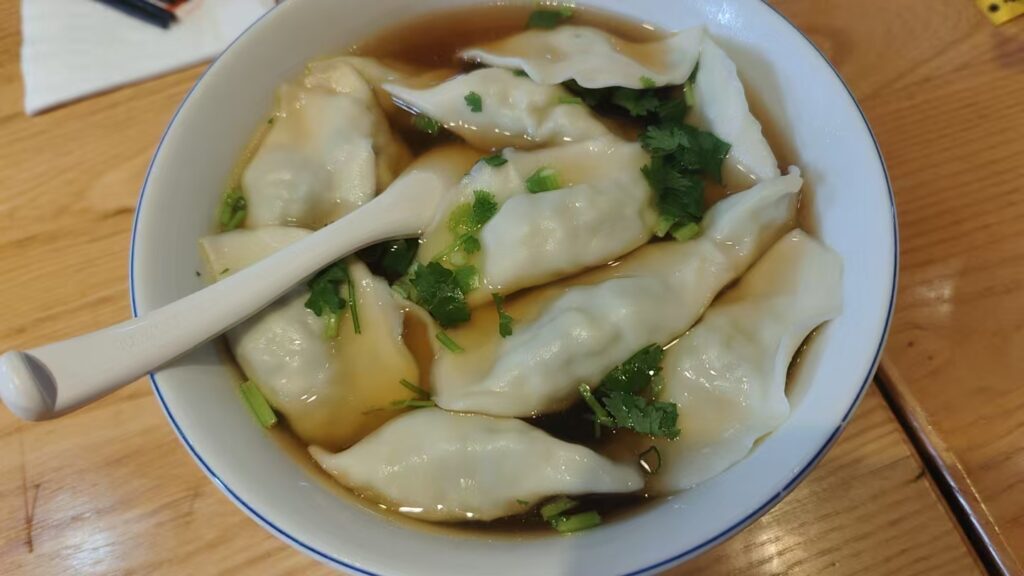照片中是一份酸汤水饺。中国的饺子有多种做法,但我最喜欢这种。酸的汤底配着馅料满满的饺子是非常完美的搭配,还可以配着紫菜、虾米等食材。早晨吃一碗,感觉一天胃里都暖乎乎,能量满满。